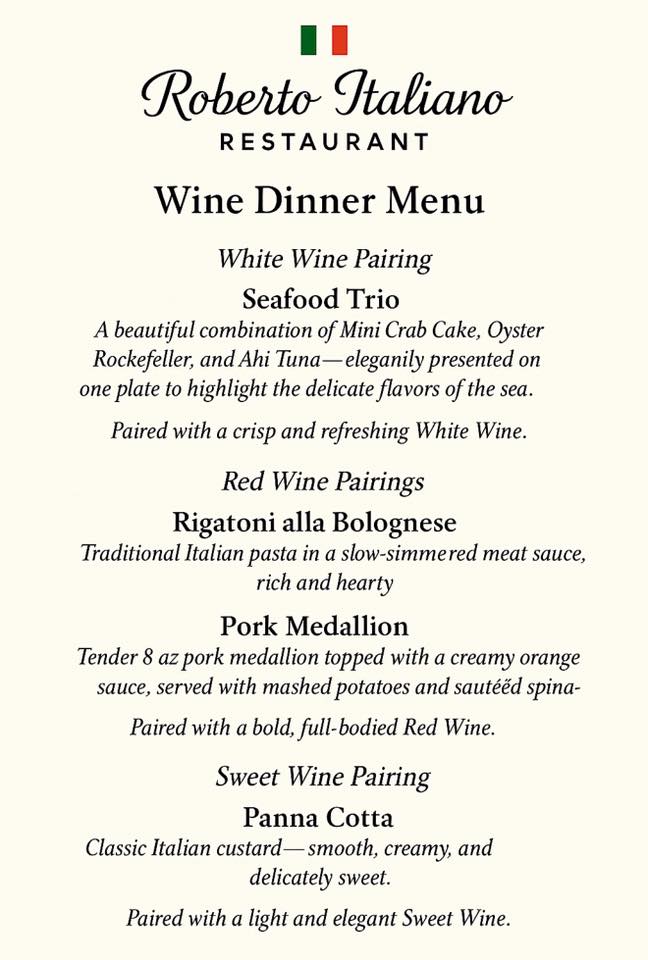 Come enjoy our delicious Seafood Trio, hearty pasta and pork pairings, and a sweet Panna Cotta all matched with the perfect wines. Reserve your spot today!