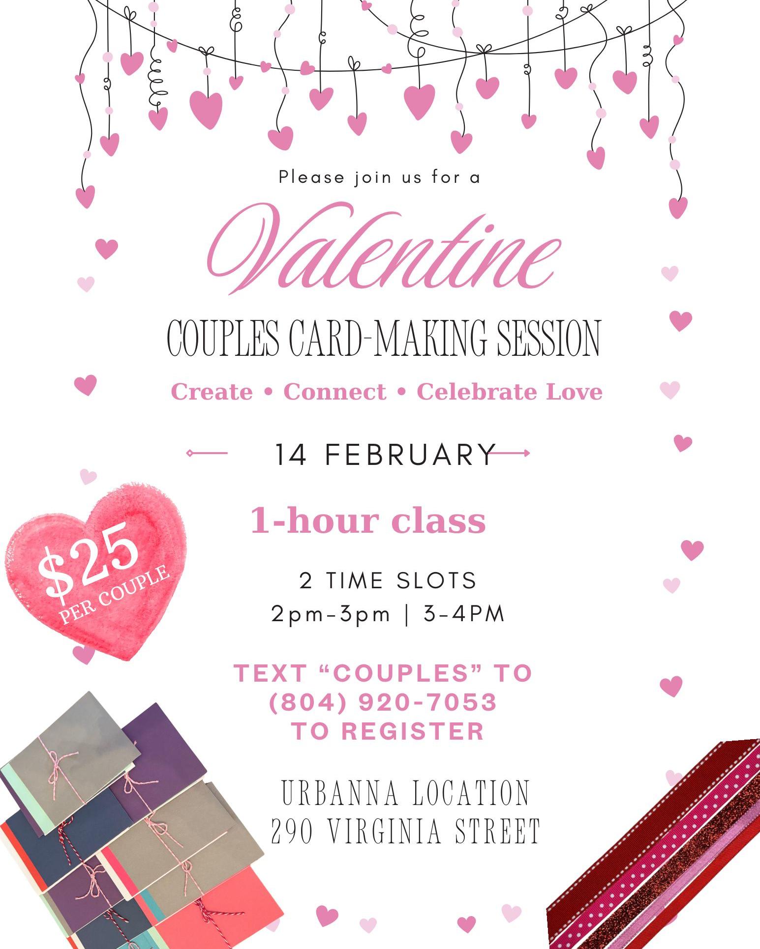 Valentine’s Couple Card Making from 2-3PM or 3-4PM, cost is $25 per couple.