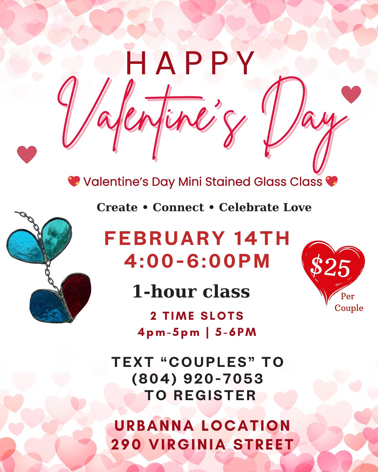 Stained Glass 2 Hearts Connected from 4-5PM or 5-6PM, cost is $25 per couple.