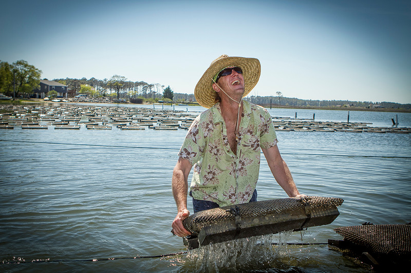 big island man in water with oysters