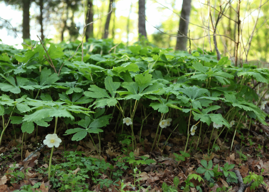 Mayapple emerges in colonies that create a sea of umbrella-like leaves across shaded woodlands in Virginia’s River Realm. These spring ephemerals bloom and leaf out briefly before fading back by early summer, making them a special find for those exploring forest trails during the heart of spring.