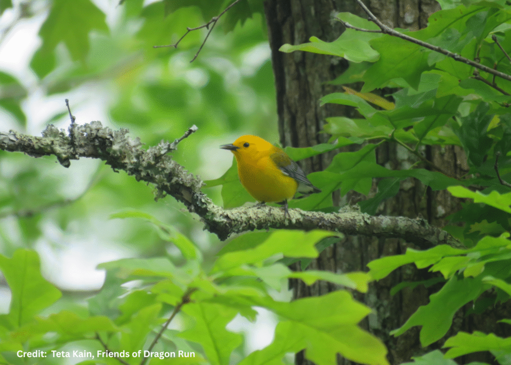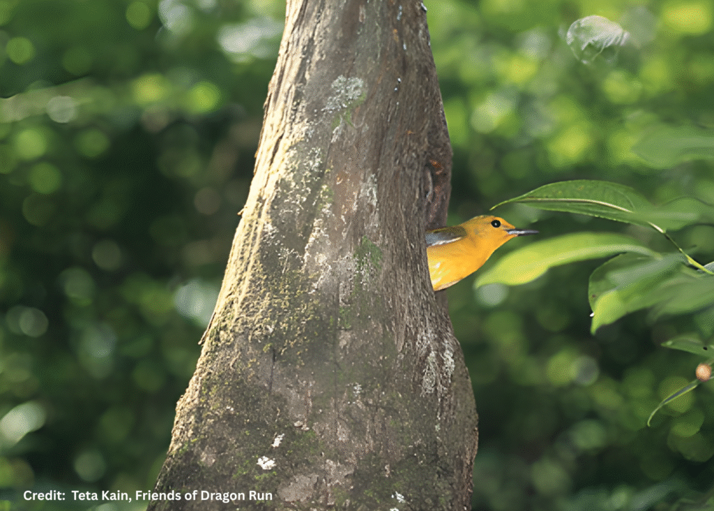 The Prothonotary Warbler returns each April to nest in swamp forests and flooded bottomlands along quiet creeks. Often called the “swamp canary,” this striking yellow songbird is a favorite sight for paddlers as it flits low over the water or perches along bald cypress knees.