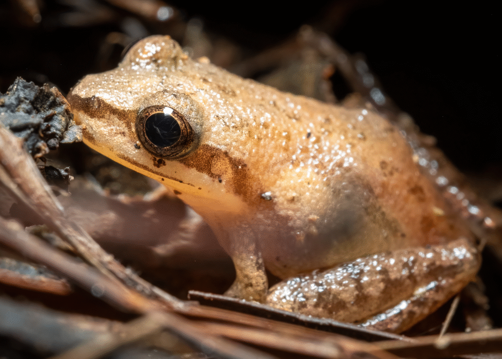 Upland chorus frogs are small, tan to brown frogs with darker stripes along their sides; they are more often heard than seen, calling from low vegetation or shallow water near wetland edges.