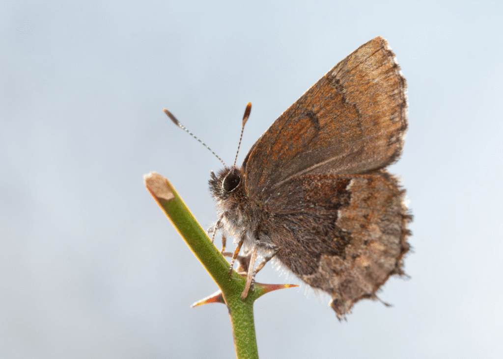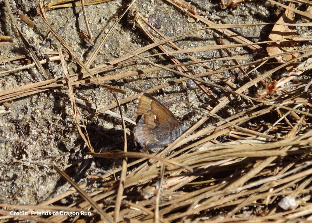 Henry’s elfin is a small brown butterfly with delicate white markings on the underside of its wings; it tends to perch low in vegetation or flit quickly through forest edges, blending easily into the leaf litter and branches.