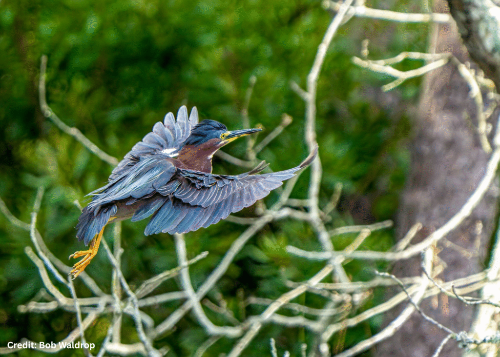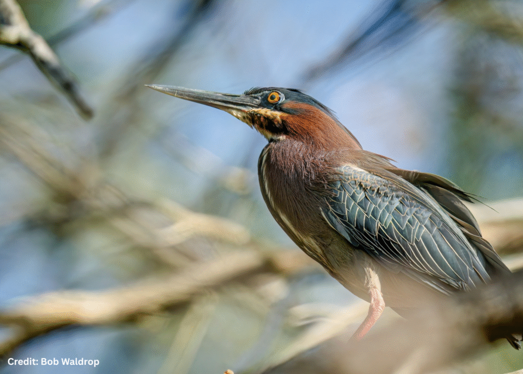 A quiet, watchful presence of spring and summer in Virginia’s River Realm, the Green Heron returns to local creeks and wetlands as the season warms. Smaller and more secretive than its larger heron cousins, this chestnut-necked wader is often spotted standing still along shaded shorelines before striking quickly at passing prey.