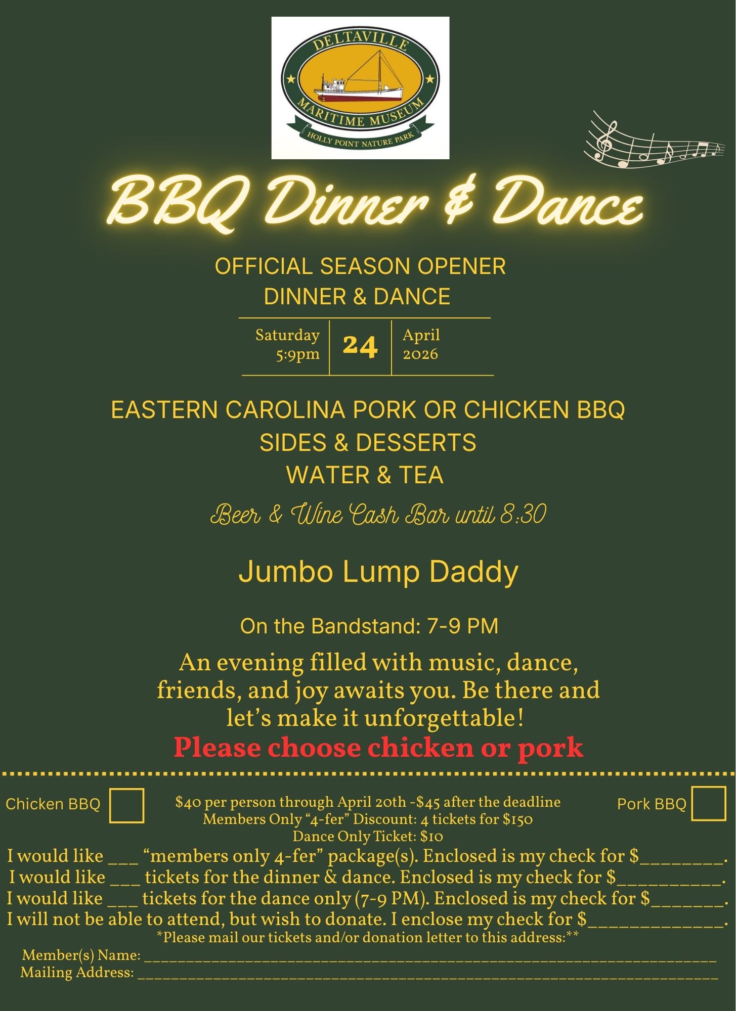 Deltaville Maritime Museum 287 Jackson Creek Road, Deltaville, VA, United StatesOfficial Season Opener Dinner & Dance on Saturday, April 24th, 2026 from 5 - 9PM. We will Eastern Carolina Pork or Chicken BBQ, Sides & Desserts, Water and Tea. Beer & Wine Cash Bar until 8:30PM. The evening will be filled with music & dance. Tickets are $40 per person through April 20th - $45 […]