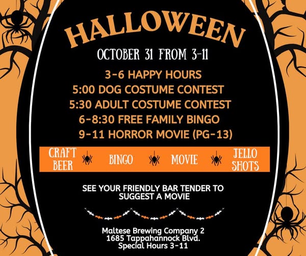 Maltese Brewing Company 2 Tappahannock Boulevard, Tappahannock, VA, United StatesGet ready for Halloween chills 'n thrills at Maltese Brewing Company 2, Tappahannock! Join our Halloween Party, Oct 31, 3-11PM. Enjoy $6 Happy Hour Pints, dog and adult costume contests, free spooky bingo and horror film! Don't miss out!
