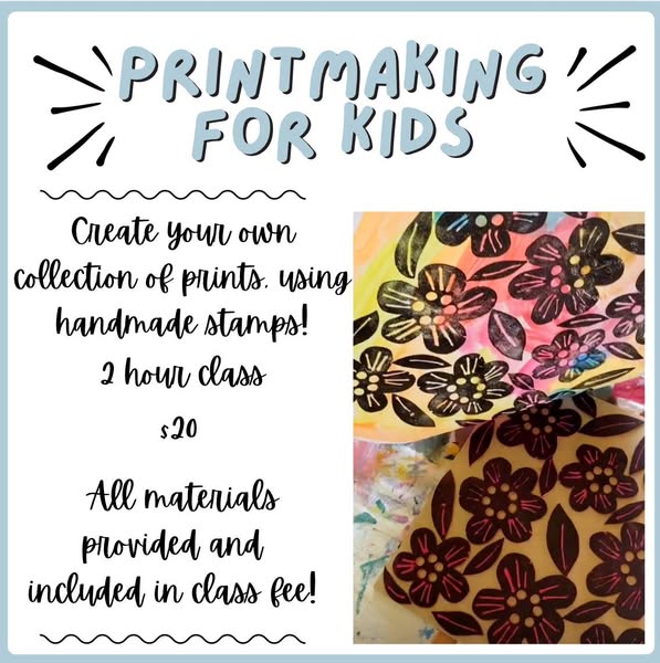 Create your own collection of prints using handmade stamps! 2 Hour Class: December 27th, 2025 10 - 12PM or 1 - 3PM. Must be accompanied by an Adult. All materials provided. Cost $20.