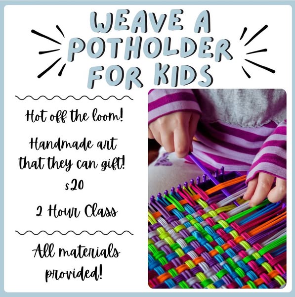 Weave a Potholder on December 23rd, 10 - 12PM or 1 - 3PM. Handmade art that they can gift! All materials provided. Must be accompanied by an Adult. Cost $20.
