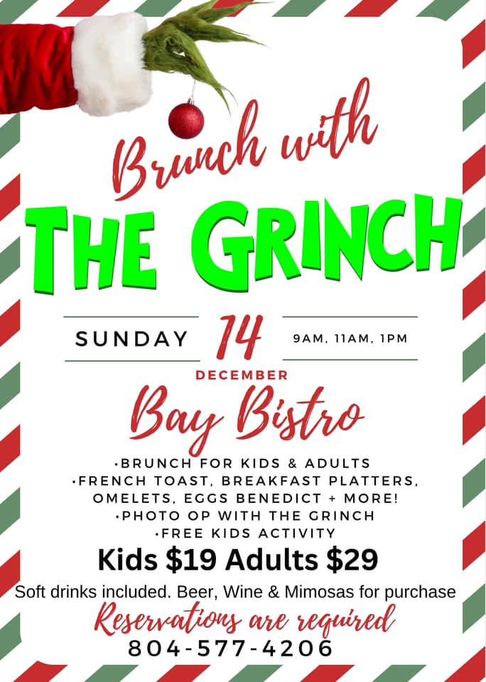 Join us at Bay Bistro on Sunday, December 14th for Brunch with the Grinch. There are three time slots: 9AM, 11AM, and 1PM. Reservations are required: 804-577-4206. Cost: Kids $19 and Adults $29.