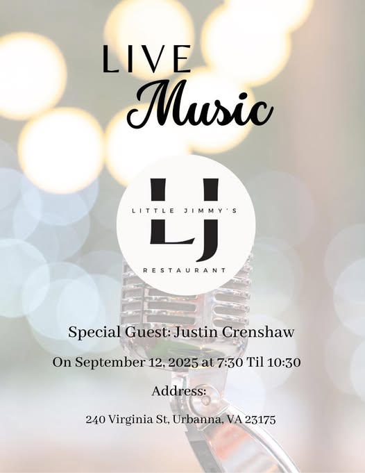 Join us at Little Jimmy's in Urbanna for live music with Justin Crenshaw Friday, September 12th, 2025 from 7:30-10:30PM.