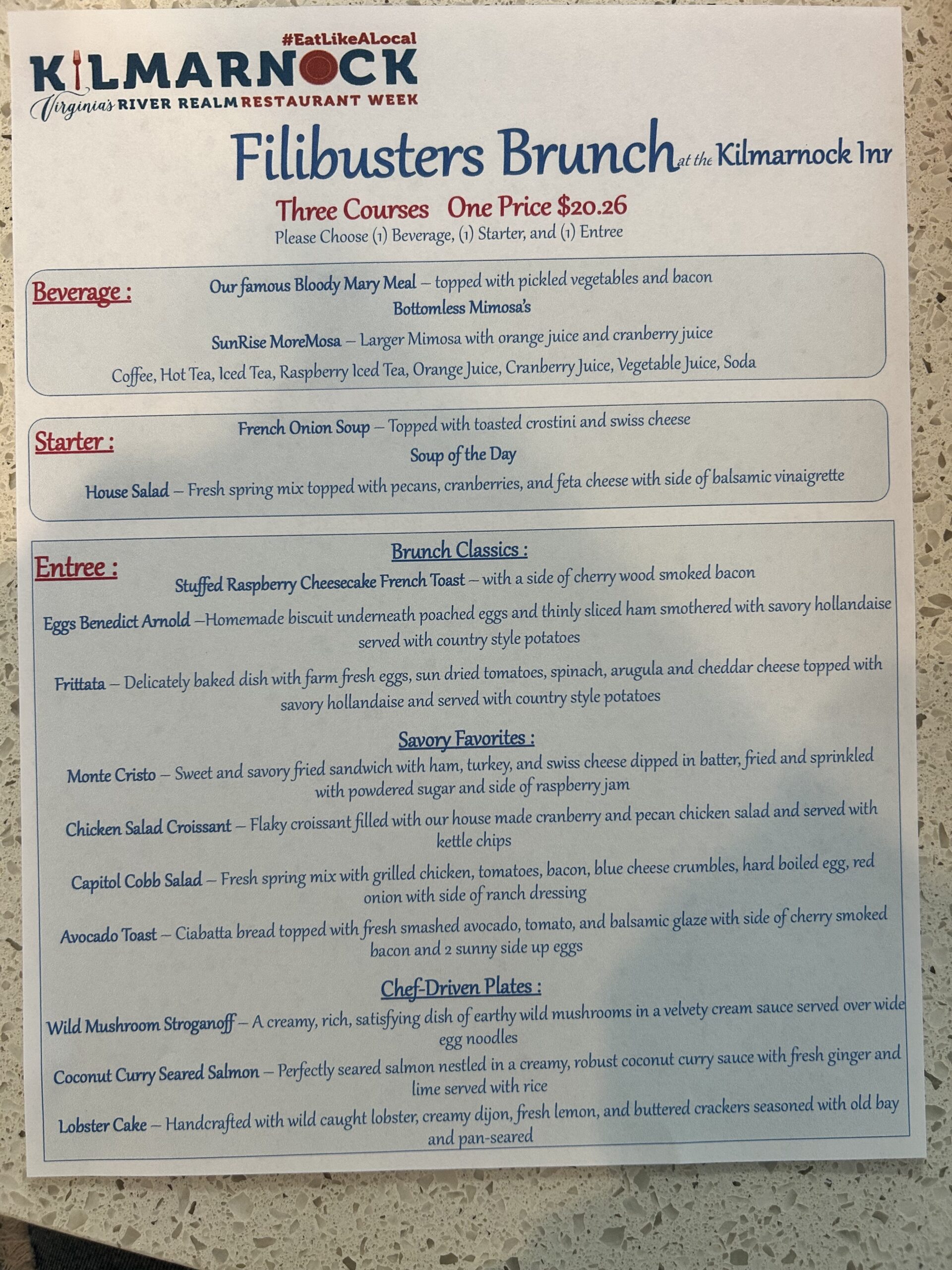Filibusters Restaurant is located inside the Wilson House at the Kilmarnock Inn. We are open Monday through Saturday for breakfast, lunch and dinner. We are also open for breakfast and brunch on Sundays. Breakfast begins at 8am and we then the lunch menu at 11am. Try our signature Bloody Mary meal. Dinner begins at 5pm and features house cut steaks, fish, scallops and shrimp prepared by our team of chefs. High quality service and amazing meals at a reasonable price. We don’t require reservations but we do recommend them so we can save your table.