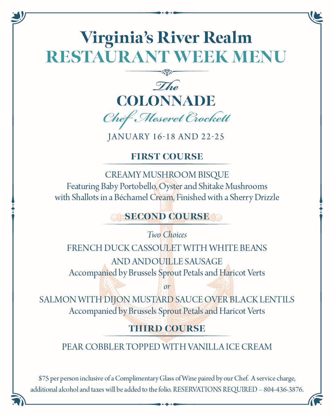Join us at The Colonnade, located inside the beautiful Hope & Glory Inn. Our fine dining experience in our majestic and grand 1,300 square foot lobby is guaranteed to exceed your expectations. We call it The Colonnade because the room is framed by 10 Doric columns that bring harmony, beauty and unity to this room surrounded by its big windows and glass doors. Our Irvington, VA restaurant offers a dining experience that you can’t find anywhere else. We pride ourselves on being the best in farm-to-table and boat-to-table dining and seek out only the finest, locally sourced vegetables and seafood. Guests rave about and keep coming back for our exquisitely prepared dishes, and we invite you to dine with us to experience it for yourself! Reservations are required and are encouraged to be made as far in advance as possible.