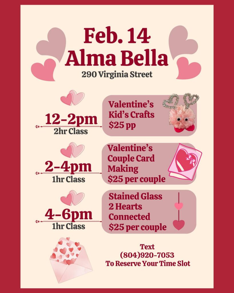 Join us at Alma Bella on February 14th, 2026. What the day entails: Valentine’s Kid’s Crafts from 12-2PM, cost is $25 per person. Valentine’s Couple Card Making from 2-3PM or […]