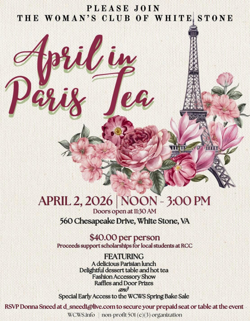 Please join the Women’s Club of White stone for April in Paris Tea on April 2nd, 2026 from 12 – 3PM. Doors open at 11:30AM. Cost is $40 per person. […]