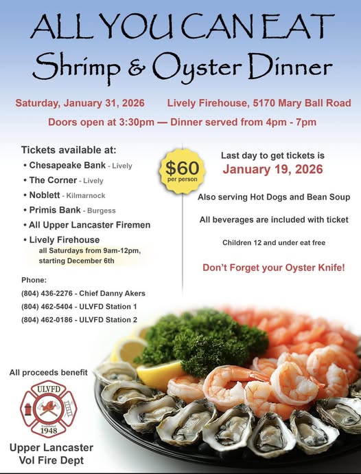 Join us at the Upper Lancaster Volunteer Fire Department for the "All You Can Eat Shrimp & Oyster Dinner" on Saturday, January 31st, 2026.  Doors open at 3:30.  Dinner served from 4PM to 7PM.  Last day to purchase tickets in January 19th.  All beverages are included with a ticket.  Children 12 and under eat free.